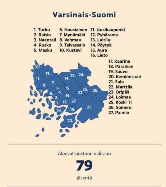 Varsinais-Suomen hyvinvointialue muodostuu 27 kunnasta (kuva ohessa) ja aluevaltuustoon valitaan 79 valtuutettua. Pakolliset hallintoelimet ovat aluevaltuustojen lisäksi aluehallitus, tarkastuslautakunta ja kaksikielilautakunta. Muita lautakuntia tullaan myös asettamaan.